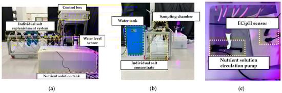 Individual salt replenishment system. (a) Front view of the ion monitoring and replenishment system. (b) Side view of the ion monitoring and replenishment system. (c) Inside view of the nutrient solution mixing tank.
