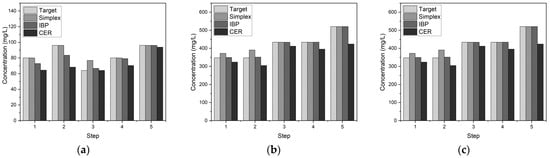The results for the predicted concentrations of nitrate ions (NO3−) after individual salt additions at each step are presented in Figure 8b. The Simplex algorithm showed excessive additions of 24.8 mg/L and 43.4 mg/L at steps 1 and 2, respectively. Excluding these, the concentrations were close to the target, with an average error of 3.9 ± 5.7% (Table 5). The IBP algorithm showed small deviations from the target concentrations at all five steps, with an average error of 0.4 ± 0.5%. The CER algorithm resulted in lower concentrations than the target at all the steps, especially at step 5 where it was 97.7 mg/L below the target, resulting in the largest error. The average error was 10.4 ± 5.4%.