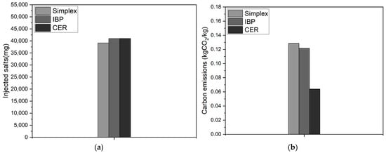 Figure 9b shows the carbon emissions from the individual salts calculated using each algorithm. The Simplex algorithm resulted in emissions of 0.12849 kg CO2, while the IBP algorithm resulted in slightly lower emissions at 0.12158 kg CO2—5.37% less than those for the Simplex algorithm (Table 6). The CER algorithm had the lowest emissions at 0.064 kg CO2—50.19% less than those for the IBP algorithm (Table 6). Although the Simplex algorithm had the lowest total individual salt usage and the CER algorithm had the highest, the latter resulted in the least carbon emissions because it prioritized the use of fertilizers with lower carbon emission factors in the algorithm.
