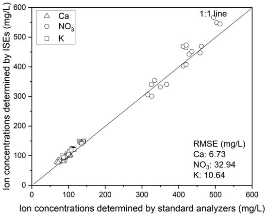 To evaluate the measurement performance of the ISEs, the measured values were compared with the actual values (Figure 10). The results present a comparison between the ion concentrations measured by ion-selective electrodes (ISEs) and those determined by standard analyzers. The performance of the ISEs was evaluated using the root mean square error (RMSE) for calcium (Ca), nitrate (NO3), and potassium (K), with values of 6.73 mg/L, 32.94 mg/L, and 10.64 mg/L, respectively.