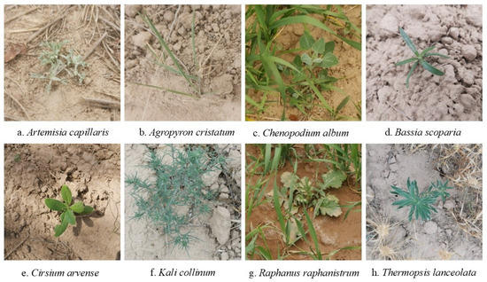 The targeted weed species, as shown in Figure 1, include Artemisia capillaris, Agropyron cristatum, Chenopodium album, Bassia scoparia, Cirsium arvense, Kali collinum, Raphanus raphanistrum, and Thermopsis lanceolata.