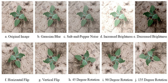 To address the initial imbalance in the collection of images across different categories, several data augmentation techniques were implemented to supplement and balance the dataset, improving its robustness, as discussed in Xu et al. [32] (2023). This approach is illustrated in Figure 2, demonstrating how these techniques result in a more representative and varied dataset. These techniques included adjusting brightness levels to simulate various lighting conditions in real-world environments, ensuring the model can effectively recognize weed species under different illumination, as seen in subfigures (d) Increased Brightness and (e) Decreased Brightness. Gaussian blur was applied to mimic varying focus conditions, as depicted in subfigure (b) Gaussian Blur, helping the model identify weeds even when images are not perfectly in focus. Additionally, salt-and-pepper noise was introduced to replicate disturbances in real-world imaging scenarios, enhancing the model’s resilience to noise, as illustrated in subfigure (c) Salt-and-Pepper Noise.