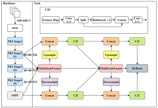 Network structure diagram of PMDNet model. Note: Stem is the initial preprocessing module for feature extraction; SPPF is a spatial pyramid pooling module for enhancing multi-scale contextual information. Concat merges feature maps from different layers to preserve multi-scale details; C2f is a feature fusion component derived from YOLOv8, designed to optimize feature representation. Upsampling increases spatial resolution for fine-grained localization. Downsampling reduces spatial resolution to capture high-level semantic features effectively. P3–P5 represent outputs of different layer feature maps. PKI Stage is the core module of the PKINet backbone; MultiScaleFusion is the core module of the self-designed feature fusion layer MSFPN, and DyHead serves as the detection head. These three components will be described in detail in the subsequent sections.