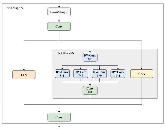The PKI module employs an Inception-style multi-scale convolution structure, using parallel depth-wise convolution kernels of varying sizes (e.g., 3 × 3, 5 × 5, 7 × 7). This design expands the receptive field without dilated convolutions, maintaining feature density and improving adaptability to varying scales, which is crucial for distinguishing small weeds from larger-scale wheat backgrounds.