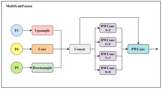 Structure diagram of MultiScaleFusion. Note: PWConv refers to Pointwise Convolution, a 1 × 1 convolution used to adjust the channel dimensions of feature maps, enabling efficient feature transformation and information fusion with minimal computational cost.