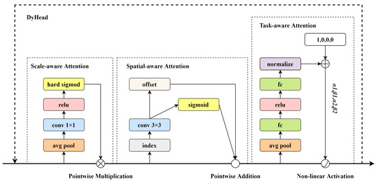 To improve the detection capability of the YOLOv8 model, especially for the intricate task of wheat field weed detection, we replaced the traditional detection head with DyHead, as described in Microsoft’s Dynamic Head model. The DyHead approach enhances feature adaptivity through a sequence of three specialized attention mechanisms: Scale Attention, Spatial Attention, and Task Attention. Figure 7 illustrates the structural organization of DyHead, emphasizing its modular attention design and the data flow between each module.
