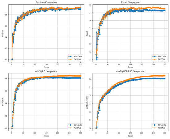 The training process analysis further demonstrated PMDNet’s stability and robustness. Throughout 300 epochs, PMDNet consistently outperformed YOLOv8n in precision, recall, and mAP metrics during training. Visualization of prediction results highlighted PMDNet’s advantage in handling challenging scenarios, such as complex backgrounds and small targets, where it consistently performed better than YOLOv8n.