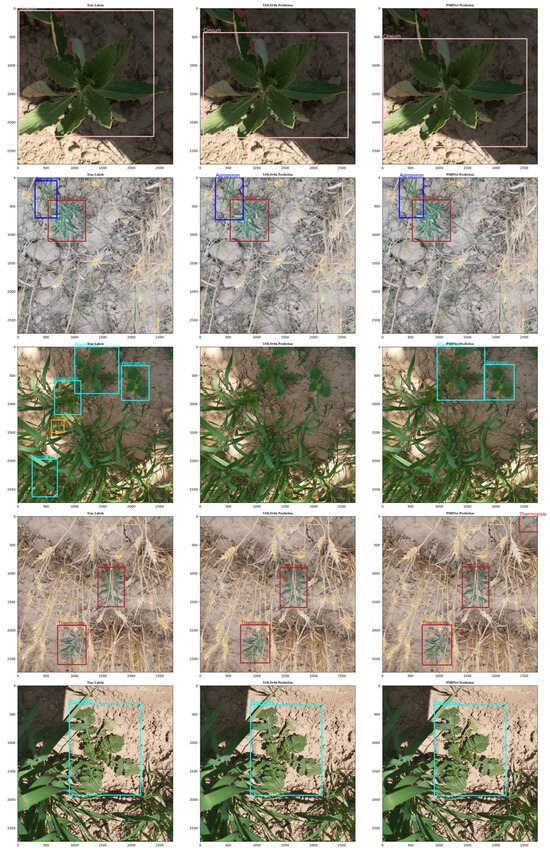 Another limitation lies in PMDNet’s performance with particularly small or slender weed targets, such as Agropyron cristatum, which results in lower recall rates. To address this, targeted optimizations will be explored, including augmenting the training dataset with synthetic samples of such targets and employing advanced detection strategies, such as anchor-free methods or multi-scale feature refinement, to improve the detection of small and slender weeds.