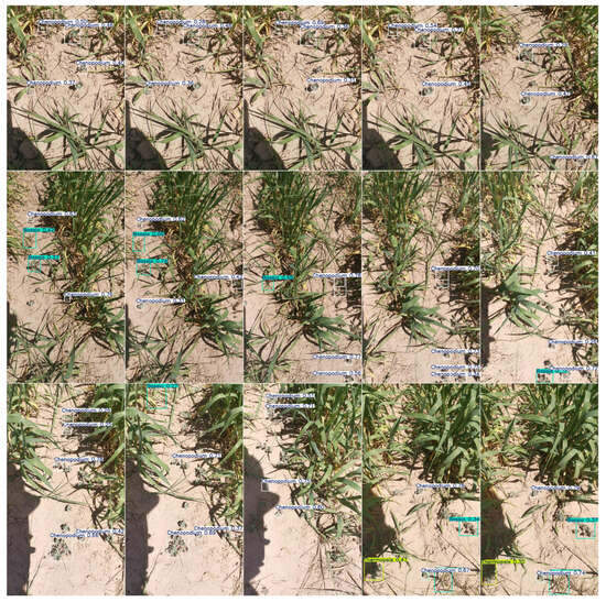 The data were gathered using a smartphone with a 40-megapixel primary camera. All photos were captured at a resolution of 2736 × 2736 pixels. Images were taken at a distance of approximately 30 cm to 100 cm from the ground, ensuring that the weeds were clearly visible while maintaining the natural context of the wheat field. Considering the training effectiveness of the YOLOv8 model, each image contains between 1 and 5 bounding boxes of target weeds, reflecting the natural distribution and density of the weeds in the field.