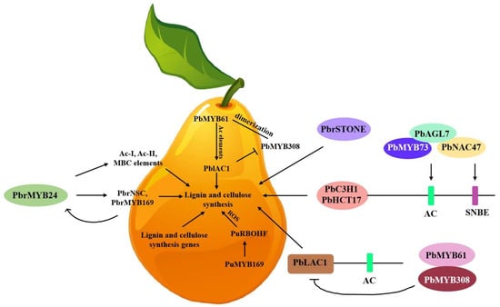Pear is a globally significant fruit, particularly favored by consumers for its crisp and sweet taste. The quality of pear fruit is determined by various factors, among which a unique type of lignified cell, the stone cell, plays a critical role. An excessive presence of stone cells results in a coarse fruit texture and inferior taste. While the transcription factors involved in stone cell formation in pear have been preliminarily identified, the mechanisms underlying their coordinated regulation remain unclear [47,48]. Recent research identified PbrMYB24 through co-expression network and transcriptome analyses. This gene exhibits a significant positive correlation with stone cell, lignin, and cellulose content across different pear cultivars [49]. Transient overexpression and gene silencing experiments in pear fruit have confirmed that PbrMYB24 promotes the accumulation of lignin and cellulose in stone cells. Overexpression of PbrMYB24 in transgenic pear callus and Arabidopsis inflorescence stems significantly increased lignin and cellulose content, as evidenced by enhanced phloroglucinol-HCl staining, safranin-fast green staining, and Calcofluor white fluorescence, along with substantial thickening of the secondary cell wall. PbrMYB24 directly activates lignin and cellulose synthesis genes by binding to different cis-elements (AC-I, AC-II, and MBS). Additionally, PbrMYB24 regulates the expression of PbrNSC and PbrMYB169, which in turn can activate PbrMYB24, forming a hierarchical regulatory network that synergistically modulates lignin and cellulose biosynthesis in stone cells [49]. This study advances our understanding of the molecular mechanisms and regulatory networks underlying lignin and cellulose synthesis in pear stone cells. It provides a theoretical foundation and genetic resources for the future genetic improvement of stone cell traits in pear fruits [49] (Figure 2).