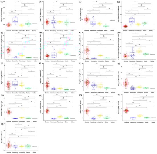 Comparison of 17 agronomic traits among different sections: Hordeum, Stenostachys, Trichostachys, Marina, and Nodosa. Box plots represent the distribution of 17 agronomic traits for each section. Statistical significance was determined using Wilcoxon rank sum tests for pairwise comparisons between sections. Significance levels are indicated by asterisks: **** p < 0.0001, *** p < 0.001, ** p < 0.01, * p < 0.05, and “ns” denotes no significant difference. The results reveal significant differences in days to flowering across several sections, with Hordeum and Stenostachys showing particularly notable differences from other sections. (A) Days to flowering, (B) Days to maturity, (C) Culm length (cm), (D) Number of triple-spikelets, (E) Central-spikelet awn length (cm), (F) Central-spikelet glume length (cm), (G) Lateral-spikelet awn length (cm), (H) Lateral-spikelet glume length (cm), (I) Spike length (cm), (J) Flag-leaves area (cm2), (K) Flag-leaves length (cm), (L) Flag-leaves width (cm), (M) 100-seed weight (g), (N) Seed area (mm2), (O) Seed length (mm), (P) Seed width (mm), (Q) Seed roundness.
