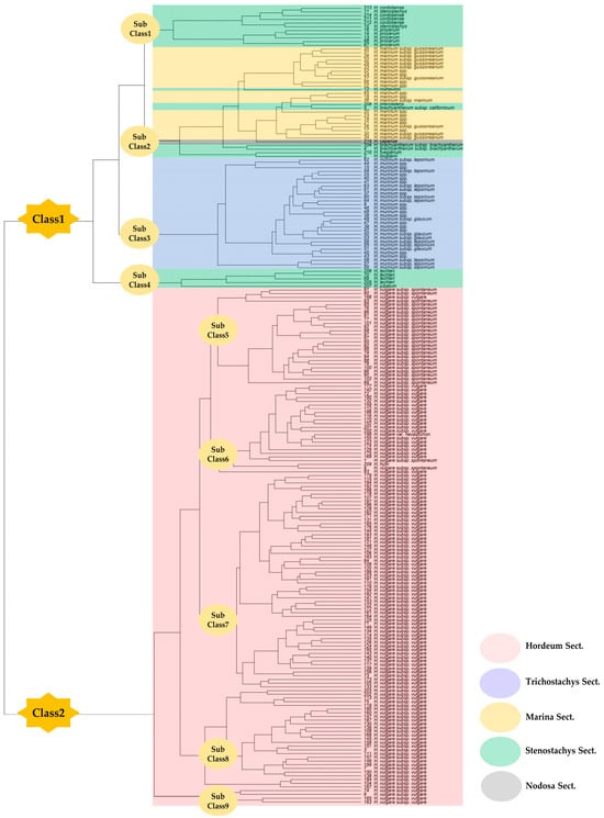 Dendrogram of the hierarchical clustering of species based on Euclidean distance and McQuitty’s (WPGMA) clustering method. The analysis grouped the species into two main classes (Class1, Class2), further divided into nine subclasses (Subclass 1–9), as indicated within the dendrogram. Each branch represents a unique taxonomic group based on the morphological traits analyzed, with clustering patterns reflecting similarity levels among the species. Class1 primarily consists of 60.5% accessions from the Hordeastrum subgenus, while Class2 is entirely composed of accessions from the Hordeum subgenus. The five sections (Hordeum, Stenostachys, Trichostachys, Marina, and Nodosa) are color-coded for clear visualization of sectional affiliations.