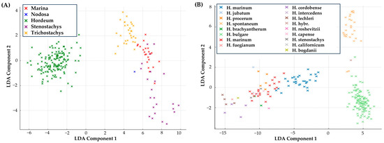 Linear Discriminant Analysis (LDA) classification results based on the top 10 traits selected from PCA (A,B). (A) The left scatter plot shows the classification of Hordeum sections using two LDA components, illustrating clear separation among the five sections: Hordeum, Stenostachys, Trichostachys, Marina, and Nodosa. (B) The right scatter plot presents species-level classification, where individual Hordeum species are distinctly separated based on the same two LDA components. These visualizations demonstrate the effectiveness of the selected traits in distinguishing both sections and species within the Hordeum genus, with high clustering consistency among groups.