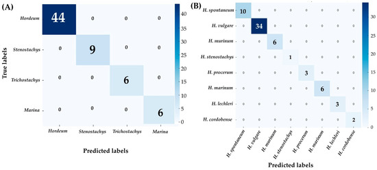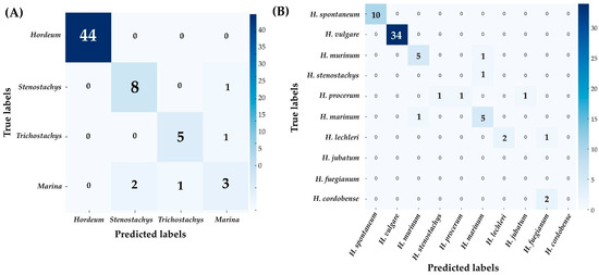 Confusion matrices for section and species classification using RF analysis based on 17 traits (A,B). The analysis was conducted with 70% of the data as training data and 30% as testing data. (A) The left confusion matrix shows the section-level classification results, demonstrating high accuracy in distinguishing sections such as Hordeum, Marina, Nodosa, Stenostachys, and Trichostachys. (B) The right confusion matrix presents species-level classification results, where most Hordeum species were accurately classified, although slight misclassifications occurred for some species. These confusion matrices visually illustrate the effectiveness of RF in classifying both sections and species within the Hordeum genus, based on the selected 17 traits.