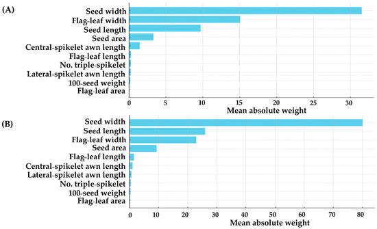 Trait importance for section and species classification using PCA-LDA (A,B). (A) The feature importance for section classification, (B) the feature importance for species classification. Traits include days to flowering, days to maturity, culm length, spike length, number of triple-spikelets, lateral-spikelet awn length, central-spikelet awn length, flag-leaf area, flag-leaf length, flag-leaf width, 100-seed weight, seed area, seed length, and seed width.