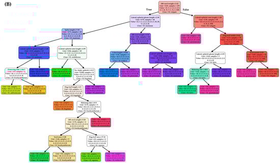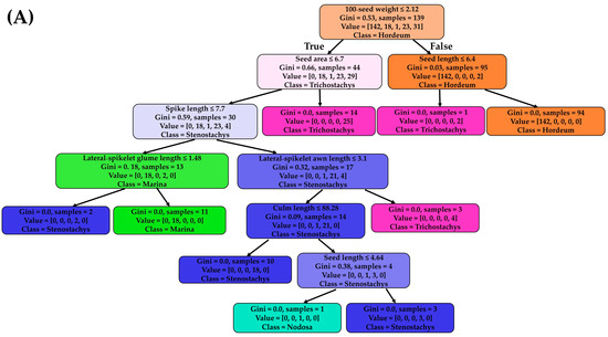 At each decision point (node), the trait threshold represents the boundary value used to split the data based on a specific trait. For example, at the first decision point in (A), if the 100-seed weight is ≤2.21, the data flow to the left branch; otherwise, they flow to the right branch. The Gini coefficient indicates the impurity at each node. A value close to 0 signifies that the data are more evenly split, while a higher value implies that the data contain a mix of different classes. Samples represent the number of data points (samples) at each node. Value indicates the number of samples belonging to each class (section) at a given node. For instance, in (A), at the first decision point, value = [1, 18, 23, 31, 142] corresponds to the following sections: Hordeum, Marina, Nodosa, Stenostachys, and Trichostachys, with 142 samples in Hordeum, 18 in Marina, 1 in Nodosa, 23 in Stenostachys, and 31 in Trichostachys. In (B), the value reflects the number of samples for each species in the following order: H. bogdanii, H. brachyantherum, H. californicum, H. capense, H. cordobense, H. fuegianum, H. hybr., H. intercedens, H. jubatum, H. lechleri, H. marinum, H. murinum, H. procerum, H. roshevitzii, H. spontaneum, H. stenostachys, and H. vulgare. Class represents the class with the highest probability of being predicted at that node.