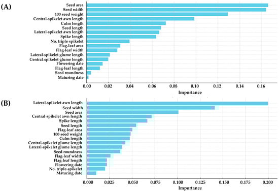 Trait importance for section and species classification using RF analysis based on 17 traits (A,B). (A) The feature importance for section classification, where seed length, culm length, seed area, and spike length are among the traits with the highest importance in distinguishing Hordeum sections. (B) The feature importance for species classification, with lateral-spikelet awn length, seed width, and seed area showing the highest contributions in differentiating Hordeum species. These graphs highlight the key traits that play a significant role in classifying both sections and species within the Hordeum genus, demonstrating the effectiveness of RF in identifying essential morphological traits for accurate classification.