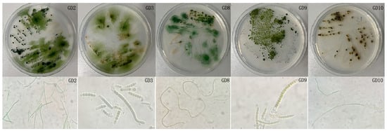 Five strains of nitrogen-fixing cyanobacteria were isolated from paddy soil, as depicted in Figure 1. All five strains were filamentous nitrogen-fixing cyanobacteria. Among them, GD2 lacked heterocysts, while the others contained heterocysts. After morphological identification, GD3 and GD9 were tentatively classified as Scytonema, GD8 as Anabaena, and GD2 and GD10 as Nostoc.
