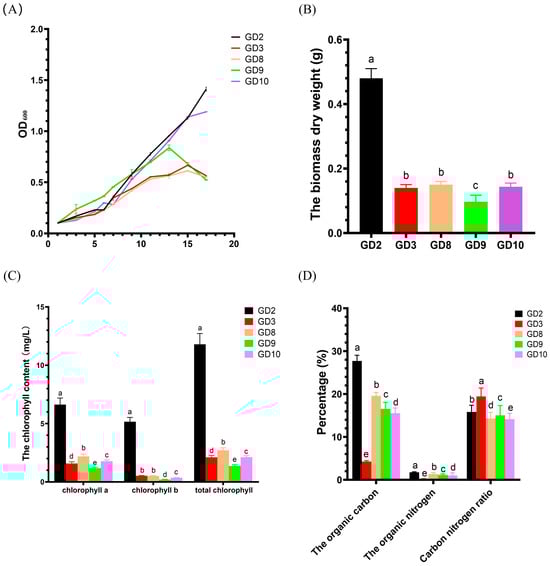 As depicted in Figure 2, it is evident that the growth rate and conditions of GD2 were significantly superior to those of other cyanobacteria strains. The chlorophyll a, chlorophyll b, and total chlorophyll content of GD2 were the highest, reaching 6.63 mg·L−1, 5.1 mg·L−1, and 11.79 mg·L−1, respectively. In addition, the organic carbon content reached 27.71%, and the organic nitrogen content reached 1.75%, both of which were highest among the five cyanobacteria strains. The biomass dry weight of GD2 was also significantly higher than that of the other cyanobacteria strains.