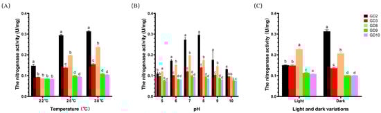 Effects of temperature, pH, light, and darkness on nitrogenase activity of cyanobacteria strains. (A) Temperature; (B) pH; (C) light and dark variations. Note: Different lowercase letters a, b, c, d indicate significant differences based on p < 0.05.