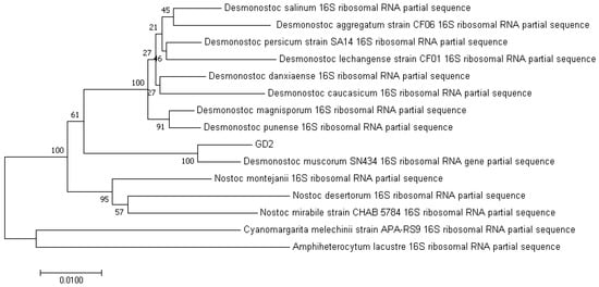 With the increase in temperature, the nitrogenase activity of the cyanobacteria also increased, peaking at 30 °C (Figure 3A). The nitrogenase activity of GD2 was significantly higher than that of other cyanobacteria strains at all temperatures. The highest enzyme activity reached 75.33 U·mg−1. As the pH value increased, the nitrogenase activity of each cyanobacteria strain initially increased and then declined. The maximum nitrogenase activity was observed between pH 7 and 8 (Figure 3B). The impact of light and dark variations on the nitrogenase activity of the cyanobacteria is illustrated in Figure 3C. The nitrogenase activity of GD2 was significantly higher at night than during the day. In contrast, the nitrogenase activity of the other cyanobacteria was slightly lower at night than during the day. To further study the high-performance GD2 cyanobacteria strains, GD2 was identified as Desmonostoc muscorum. This identification was achieved through 16S rDNA sequence analysis, comparison, and the construction of a phylogenetic tree, as shown in Figure 4.