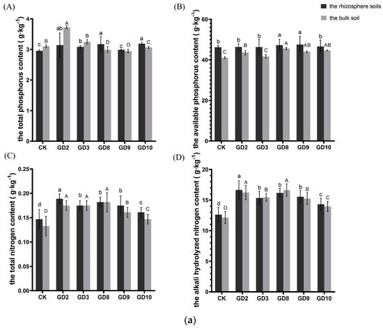 After treatment with nitrogen-fixing cyanobacteria, the rhizosphere soil of rice plants was collected to determine its physical and chemical properties. As depicted in Figure 5a, the application of nitrogen-fixing cyanobacteria has a noticeable impact on the physicochemical properties of both the rhizosphere soils and the bulk soil of rice. The total phosphorus content and available phosphorus content in the bulk soil of the GD2 treatment significantly increased. Nonetheless, no significant difference was observed in the total phosphorus content in the soil of the other treatments. However, the application of GD8, GD9, and GD10 significantly increased the effective phosphorus concentration in the soil outside the roots. In addition, the application of nitrogen-fixing cyanobacteria significantly increased the total nitrogen content and alkali hydrolyzed nitrogen content in both the rhizosphere soil and bulk soil of rice. The total nitrogen content in the rhizosphere soil of the GD2 treatment increased by 28.57% compared to the CK. Moreover, the total nitrogen content in the soil outside the roots increased by 31.58%. The alkali-hydrolyzed nitrogen content in the rhizosphere soil increased by 31.83% compared to the CK rhizosphere soil.