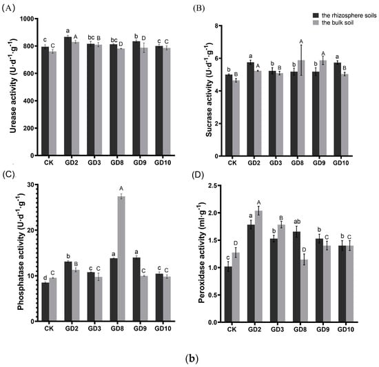 Soil enzyme activity is an important indicator for assessing soil fertility. The impact of nitrogen-fixing cyanobacteria on soil enzyme activity is illustrated in Figure 5b. The application of nitrogen-fixing cyanobacteria significantly increased the activity of soil urease, soil sucrose, and soil peroxidase. The GD2 treatment had the most significant effects, with urease activity increasing by 9.05% in rhizosphere soil and 9.15% in extraneous soil. Sucrase activity increased by 15.2% in rhizosphere soil and 5.1% in bulk soil. Peroxidase activity showed a 75% increase in rhizosphere soil and a 60% increase in extraneous soil.