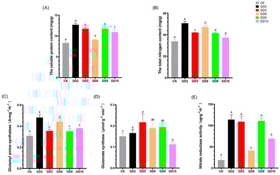 As shown in Figure 6A,B, all five strains of nitrogen-fixing cyanobacteria increased the soluble protein and total nitrogen content in rice seedling leaves. The increases in the soluble protein and total nitrogen content of rice leaves treated with GD2 were significantly higher than those of the other four strains of nitrogen-fixing cyanobacteria and the control group. Soluble protein content increased by 52.89%, and total nitrogen content increased by 48.73%. The activities of nitrate reductase (NR), glutamyl amine synthetase (GS), and glutamate synthase (GOGAT) in the leaves of rice seedlings were increased to varying degrees after the application of nitrogen-fixing cyanobacteria. These enzymes were significantly higher than those of untreated plants. The activities of glutamine synthetase and nitrate reductase after GD2 treatment were significantly higher than those of the other four algae strains. Specifically, the enzyme activities increased by 56.22% and 498.84%, respectively, compared to the CK treatment.