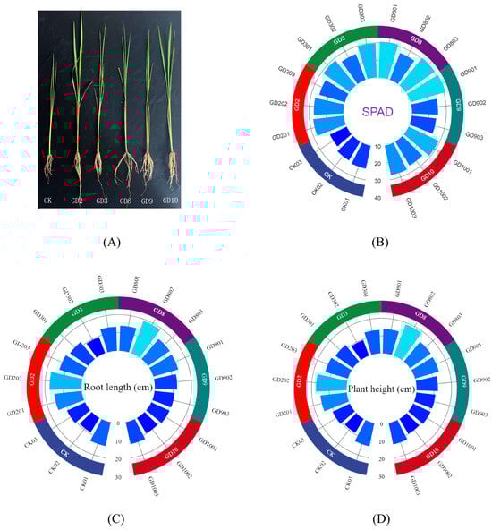 The phenotypes of rice seedlings treated with different nitrogen-fixing cyanobacteria are shown in Figure 7. The growth-promoting effect of the GD2 strain on rice growth was significantly higher than that of the control and other strains. After GD2 treatment, the plant height of rice was notably higher than that of other cyanobacteria treatments. The root length and SPAD value of rice leaves were significantly greater than those of the control treatment. However, these measurements were still lower than those of the GD8 treatment. In conclusion, as depicted in Figure 7B–D, plant height, root length, and SPAD value all improved following the application of nitrogen-fixing cyanobacteria. The use of nitrogen-fixing cyanobacteria proved beneficial to the growth of rice seedlings, particularly the GD2 strain.