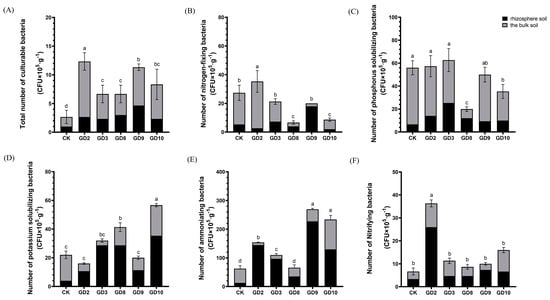 To investigate the impact of nitrogen-fixing cyanobacteria on the number of soil microorganisms, the number of five soil microorganism functional traits was measured, including ammonifying bacteria, nitrifying bacteria, nitrogen-fixing bacteria, potassium-solubilizing bacteria, and phosphorus-solubilizing bacteria. The results are illustrated in Figure 8. In comparison to the CK treatments, GD2, GD3, GD8, GD9, and GD10 increased the total number of rhizosphere and bulk soil bacteria by 366%, 200%, 166%, 133%, and 133%, respectively. Among these, the rhizosphere and bulk soil microorganisms increased to varying degrees. GD2 showed the most significant increase among the cyanobacteria treatments. Soil nitrogen-fixing bacteria in the GD2 treatment increased significantly. In contrast, other treatments exhibited varying degrees of reduction compared to CK. The number of phosphorus-solubilizing bacteria was significantly higher under GD2 and GD3 treatment compared to CK. The number of potassium-solubilizing bacteria under GD2 and GD9 treatments did not differ significantly from CK. However, other cyanobacteria treatments showed a significant increase in the number of potassium-solubilizing bacteria compared to CK (p < 0.05). The number of soil ammonifying bacteria under GD2, GD3, GD9, and GD10 treatments was significantly higher compared to CK (p < 0.05). Nonetheless, there was no significant difference between GD8 and CK. The number of nitrifying bacteria in the GD2 treatment was significantly higher than in other treatments and CK.