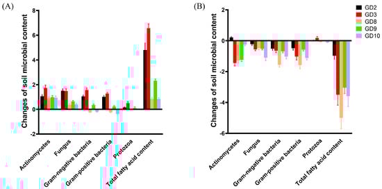 Changes of soil microbial content in different nitrogen-fixing cyanobacteria treatments based on PLFA. (A) The rhizosphere soil; (B) the bulk soil.