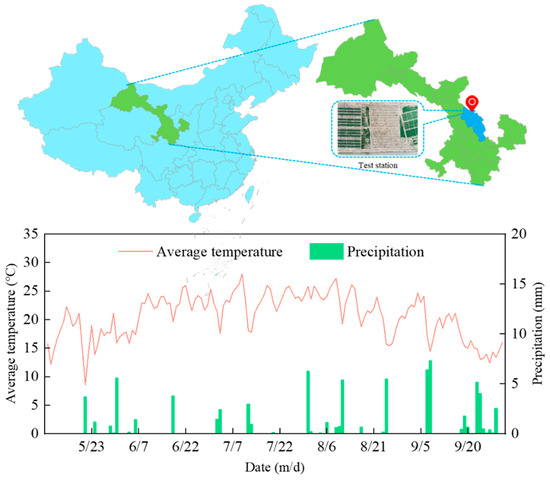 The experiment was conducted from April to October 2023 at the Irrigation Experiment Station of Jingtai Chuan Power Lift Irrigation Water Resources Utilization Center in Gansu Province (37°12′ N, 104°5′ E). The average elevation of the test area was 1562 m. The climate of the region is temperate, arid continental, characterized by 2652 h of annual sunshine, an average annual temperature of 8.6 °C, and an average annual precipitation of 191.6 mm. The frost-free period lasts for 191 days. During the experiment, the average daily temperature was 20.61 °C, and the total effective precipitation was 75.10 mm (Figure 1). The soil at the experimental site is predominantly sandy loam, with a dry bulk density of 1.63 g/cm3 in the 0–120 cm layer and a maximum water-holding capacity of 24.10%. The nutrient contents of the soil were as follows: 13.20 g/kg of organic matter, 1.62 g/kg of total nitrogen, 1.32 g/kg of total phosphorus, 34.03 g/kg of total potassium, 74.51 mg/kg of quick-acting nitrogen, 26.31 mg/kg of quick-acting phosphorus, 173.02 mg/kg of quick-acting potassium, and a pH of 8.11.