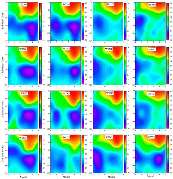 Water and nitrogen regulation significantly influenced the spatial and temporal distribution of soil water content in the root zone of Lycium barbarum (Figure 2). Generally, soil water content increased initially and then decreased during the fertility period and with increasing soil depth. In the 0–60 cm soil layer, water content fluctuated most significantly during the fertility period, initially decreasing and then increasing. Under the same irrigation levels, the average soil water content followed the order: N0 (12.92–23.17%) > N1 (12.65–21.85%) > N2 (11.41–20.72%) > N3 (10.92–20.02%). Similarly, at the same nitrogen application levels, the trend was W3 (14.41–25.93%) > W2 (12.43–25.15%) > W1 (12.41–20.13%) > W0 (11.82–19.24%). For the 60–100 cm soil layer, the average water content was higher than in the 100–120 cm layer. The soil water content of W3 increased by 4.37–13.5% compared to W0, and W2 increased by 4.37–13.92%. Similarly, N0 exhibited 7.26–19.31% higher average soil water content compared to N1, N2, and N3. For the 100–120 cm soil layer, variations in soil water content among treatments were minimal. Across all treatments, the soil water content in this layer slowly decreased with depth but slightly increased as the fertility period progressed.