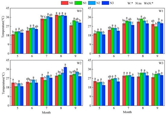 Variation of inter-root soil temperature in Lycium barbarum under different water and nitrogen treatments. Note: Different lowercase letters indicate that there is a significant difference between different nitrogen application rates under the same irrigation amount (p < 0.05). W—water treatment; N—nitrogen application treatment; W × N—interaction. In the analysis of variance, * indicated that the correlation reached a significant level (p < 0.05), and ns indicated that the correlation was not significant (p > 0.05).