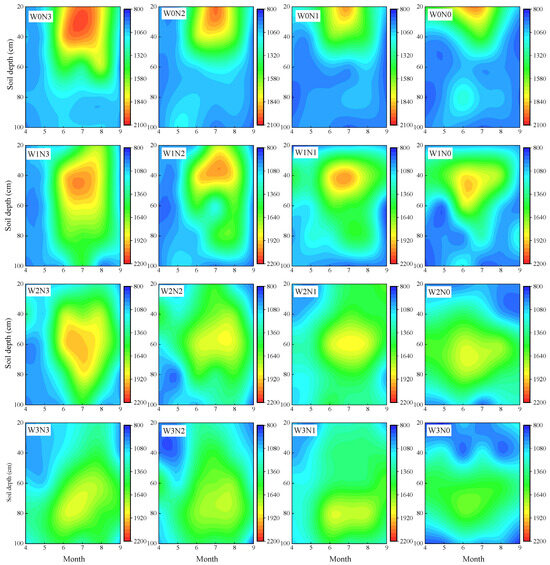 Water and nitrogen regulation also had a pronounced effect on the temporal and spatial distribution of soil salinity in the root zone (Figure 4). Soil salinity peaked from June to August (flowering-fruiting period) and was relatively lower during May–June (nutrient growth-flowering stage) and August–September (fruiting-defoliation stage). Salinity content generally decreased with increasing soil depth. At the same nitrogen application levels, the lowest average soil conductivity in the 0–40 cm layer was observed under W3 (386.93 μS/cm), which was 9.25%, 14.31%, and 18.26% lower than W2, W1, and W0, respectively. In the 40–80 cm layer, the lowest conductivity occurred under W0 (393.43 μS/cm). For the 80–100 cm layer, W0 again exhibited the lowest conductivity (375.8 μS/cm), which was 10.97%, 20.34%, and 26.87% lower than W1, W2, and W3, respectively. At the same irrigation levels, the lowest soil conductivity across all layers was found under N0, which was 7.53%, 15.28%, and 18.74% lower than N1, N2, and N3, respectively. The W3N0 treatment achieved the lowest average soil salinity content (189.93 μS/cm) across the 0–100 cm depth during the entire reproductive period.