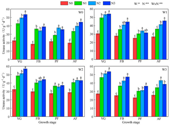 Variation of inter-root soil urease activity in Lycium barbarum under different water and nitrogen treatments. Note: Different lowercase letters indicate that there is a significant difference between different nitrogen application rates under the same irrigation amount (p < 0.05). W—water treatment; N—nitrogen application treatment; W × N—interaction. In the analysis of variance, * and ** indicated that the correlation reached a significant level (p < 0.05) and a very significant level (p < 0.01), respectively.