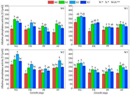 Variation of inter-root soil alkaline phosphatase activity in Lycium barbarum under different water and nitrogen treatments. Note: Different lowercase letters indicate that there is a significant difference between different nitrogen application rates under the same irrigation amount (p < 0.05). W—water treatment; N—nitrogen application treatment; W × N—interaction. In the analysis of variance, * and ** indicated that the correlation reached a significant level (p < 0.05) and a very significant level (p < 0.01), respectively.