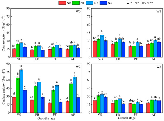 Variation of inter-root soil catalase activity in Lycium barbarum under different water and nitrogen treatments. Note: Different lowercase letters indicate that there is a significant difference between different nitrogen application rates under the same irrigation amount (p < 0.05). W—water treatment; N—nitrogen application treatment; W × N—interaction. In the analysis of variance, * and ** indicated that the correlation reached a significant level (p < 0.05) and a very significant level (p < 0.01), respectively.