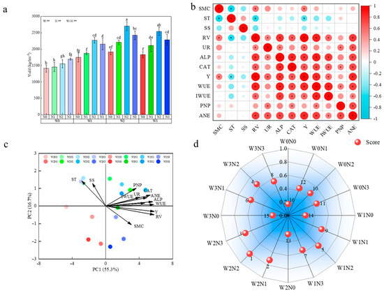 Variation of yield and economic efficiency in Lycium barbarum under different water nitrogen treatments. Note: (a) shows the variation of Lycium barbarum yield between different water and nitrogen treatments; (b) shows the correlation analysis between indicators under different water and nitrogen regulation; (c) shows the eigenvalue and variance contribution ratio of principal component analysis between different treatments; (d) shows the comprehensive scores of different water and nitrogen treatments. Where different lowercase letters indicate that there is a significant difference between different nitrogen application rates under the same irrigation amount (p < 0.05). W—water treatment; N—nitrogen application treatment; W × N—interaction. In the analysis of variance, * and ** indicated that the correlation reached a significant level (p < 0.05) and a very significant level (p < 0.01), respectively.