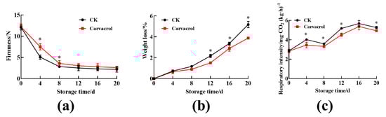 Effects of the carvacrol treatment on firmness (a), weight loss rate (b), and respiratory intensity (c). The symbol ‘*’ means a significant difference (p < 0.05).