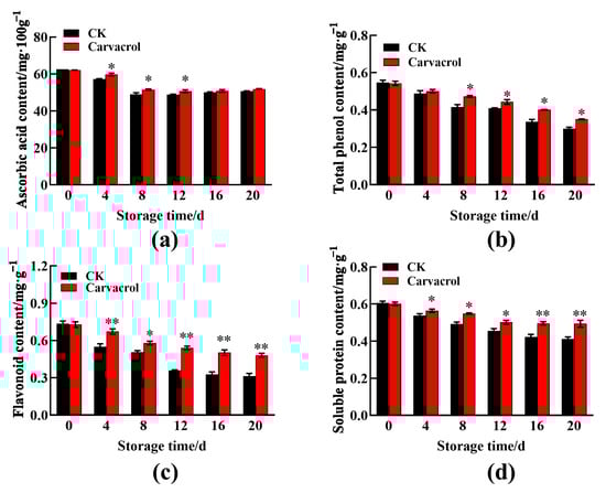 Effects of the carvacrol treatment on VC (a), total phenol (b), flavonoid (c), and soluble protein (d) contents. The symbol ‘*’ means a significant difference (p < 0.05), while ‘**’ means an extremely significant difference (p < 0.01).