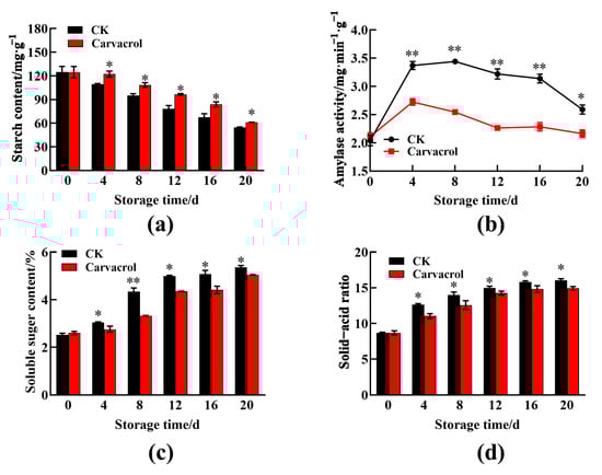Effects of the carvacrol treatment on starch content (a), amylase activity (b), soluble sugar content (c), and solid–acid ratio (d). The symbol ‘*’ indicates a significant difference (p < 0.05), while ‘**’ indicates an extremely significant difference (p < 0.01).