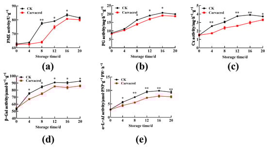 Effects of carvacrol on the activities of PME (a), PG (b), CX (c), β-gal (d), and α-L-Af (e). The symbol ‘*’ means a significant difference (p < 0.05), ‘**’ means an extremely significant difference (p < 0.01).