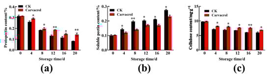 Effects of carvacrol on the contents of protopectin (a), soluble pectin (b), and cellulose (c). The symbol ‘*’ means a significant difference (p < 0.05), while ‘**’ means an extremely significant difference (p < 0.01).
