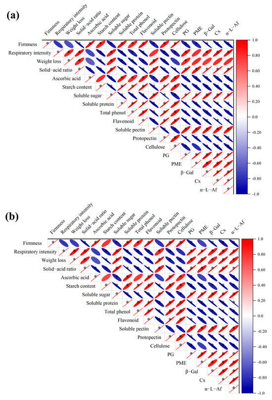As shown in the correlation analysis graph presented in Figure 6, most indicators in the carvacrol-treated samples exhibited significant positive or negative correlations with each other (p < 0.05). In the control group, kiwifruit firmness demonstrated highly significant negative correlations (p < 0.01) with weight loss, solid–acid ratio, β-Gal, CX, and α-L-Af; conversely, it showed highly significant positive correlations (p < 0.01) with VC and cellulose content. Additionally, starch content revealed highly significant negative correlations (p < 0.01) with amylopectin, soluble sugars, and solid–acid ratio. Furthermore, the firmness of the kiwifruits treated with carvacrol displayed a highly significant negative correlation with both the solid–acid ratio and certain cell-wall-metabolizing enzymes (p < 0.01), while exhibiting a highly significant positive correlation with VC and cellulose content (p < 0.01). Starch content also indicated robust negative correlations (p < 0.01) with amylase activity, soluble sugars, and solid–acid ratio, simultaneously demonstrating strong positive correlations (p < 0.01) with soluble protein levels, protopectin concentration, total phenols content, and flavonoids.