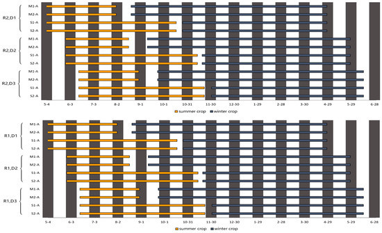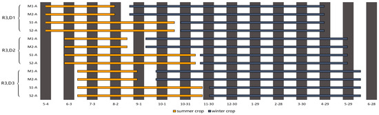 Growth period during cultivation period of 2019–2020 (the 1st round) (R1), 2020–2021 (the 2nd round) (R2), and 2021–2022 (the 3rd round) (R3) including double-cropping systems maize Dongdan 60–alfalfa WL525 (M1–A), maize Dongdan 1331–alfalfa WL525 (M2–A), sorghum 1230–alfalfa WL525 (S1–A), and sorghum cfsh30–alfalfa WL525 (S2–A). D1 represents suitable sowing, D2 represents suitable delayed sowing, and D3 represents late sowing.