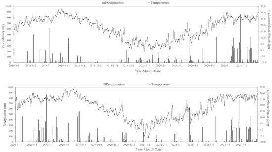 Rainfall and temperature data from 2019 to 2022 were provided by Yangzhou Meteorological Bureau. Rainfall and temperature were monitored during the three experimental years parallel to the vegetation period. Temperature was recorded hourly. Daily and monthly means including standard deviation were calculated.