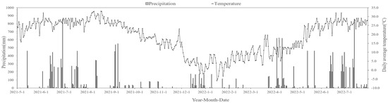 The precipitation and average air temperature profile during cultivation periods of 2019–2020 (the 1st round), 2020–2021 (the 2nd round), and 2021–2022 (the 3rd round).