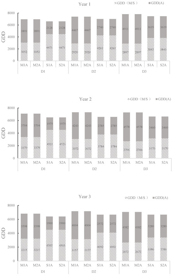 GDDs is an attribute reflecting the accumulated temperature during crop growth in the field, exhibiting strong regularity over the three rounds. As the sowing date was delayed, the GDDs values of M1 and M2 decreased, while the GDDs value of A increased. The total GDDs values for different annual rotation systems showed an increasing trend with the postponement of the sowing date. When the sowing dates were the same, the GDDs values of M1 and M2 were lower than those of S1 and S2, but the total GDDs values of M1–A and M2–A were greater than those of S1–A and S2–A (Figure 3).