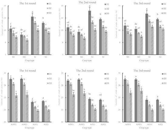 The crude protein content of maize/sorghum and alfalfa in 2019–2020 (the 1st round) (R1), 2020–2021 (the 2nd round) (R2), and 2021–2022 (the 3rd round) (R3). D1 represents suitable sowing, D2 represents suitable delayed sowing, and D3 represents late sowing. M1 represents maize Dongdan 60, M2 represents maize Dongdan 1331, S1 represents sorghum 1230, and S2 represents sorghum cfsh30. A (M1) represents alfalfa following the preceding crop of maize Dongdan 60, A (M2) represents alfalfa following the preceding crop of maize Dongdan 1331, A (S1) represents alfalfa following the preceding crop of sorghum 1230, and A (S2) represents alfalfa following the preceding crop of sorghum cfsh30. Means followed by the same letters do not differ by Tukey’s test (p > 0.05).